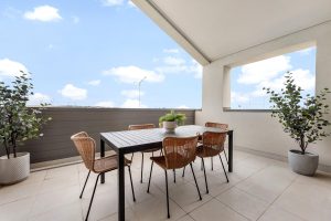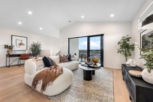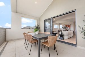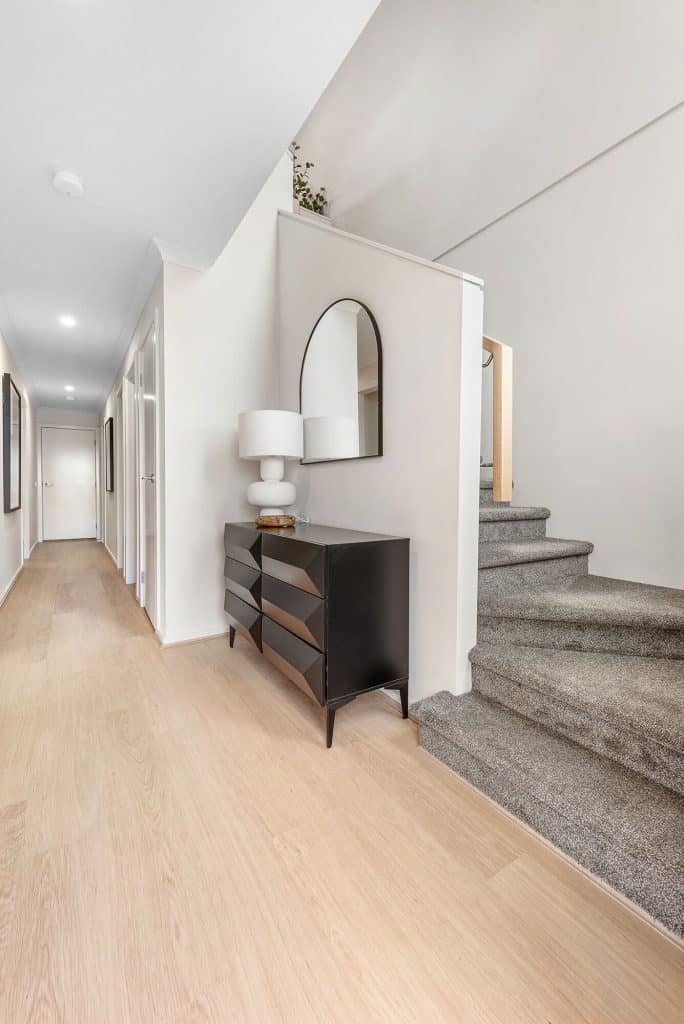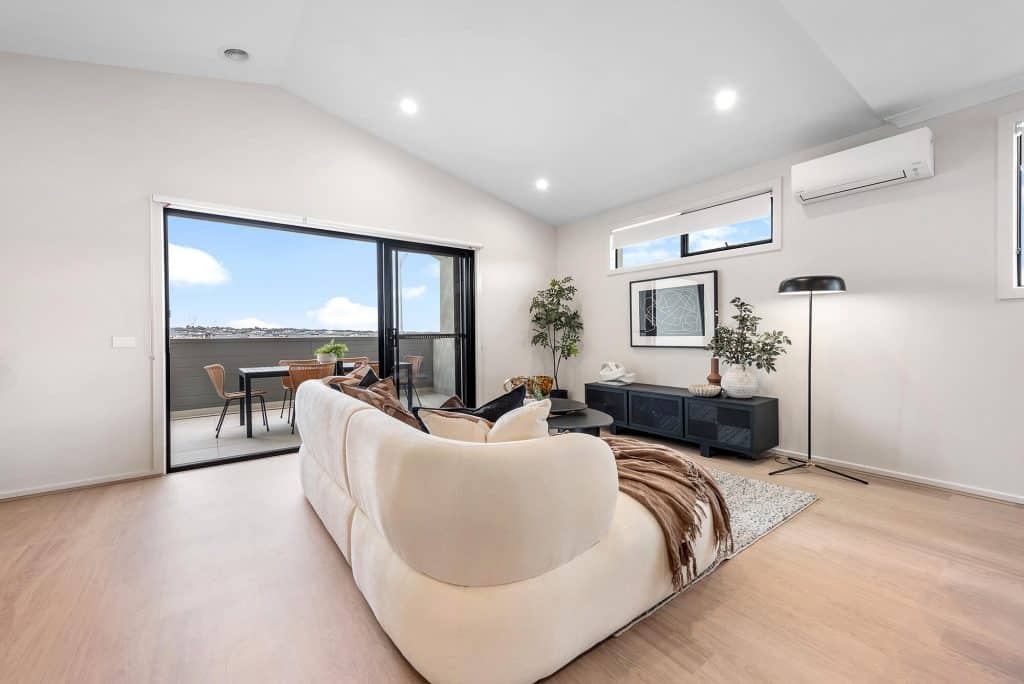 From the front porch, the home opens to a welcoming entry with private accommodation thoughtfully located on the ground level. Bedrooms are well separated from the main living areas and serviced by a central bathroom, creating a quiet retreat. Upstairs, the home opens into a light-filled living, kitchen and dining zone positioned to capture natural light and outlook. The kitchen sits at the centre of the space, ideal for everyday living and entertaining. Sliding doors extend the living area onto a generous balcony, creating a seamless indoor–outdoor connection. The reverse living design ensures brighter living spaces, improved privacy and a functional flow throughout the home.